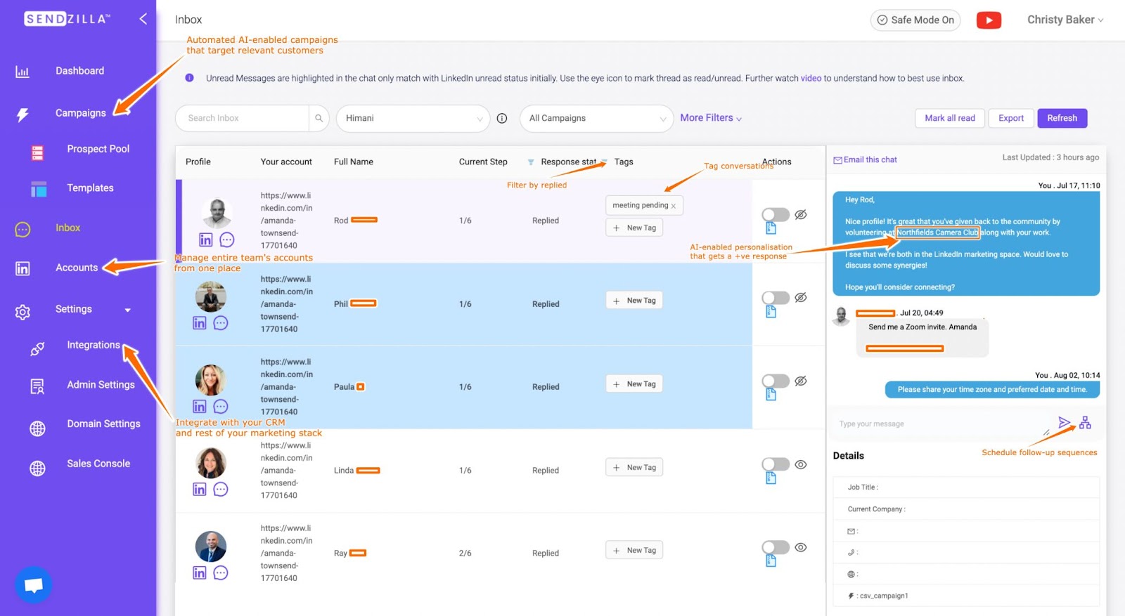 Sendzilla is a dead-simple LinkedIn automation tool. You bring your Sales Navigator list of ideal prospects/custom sheet and your sequence of messages (connection requests and follow-ups) and it automates your manual work. Alternatively, we have an artificial intelligence engine that sends highly personalized connection messages :)
