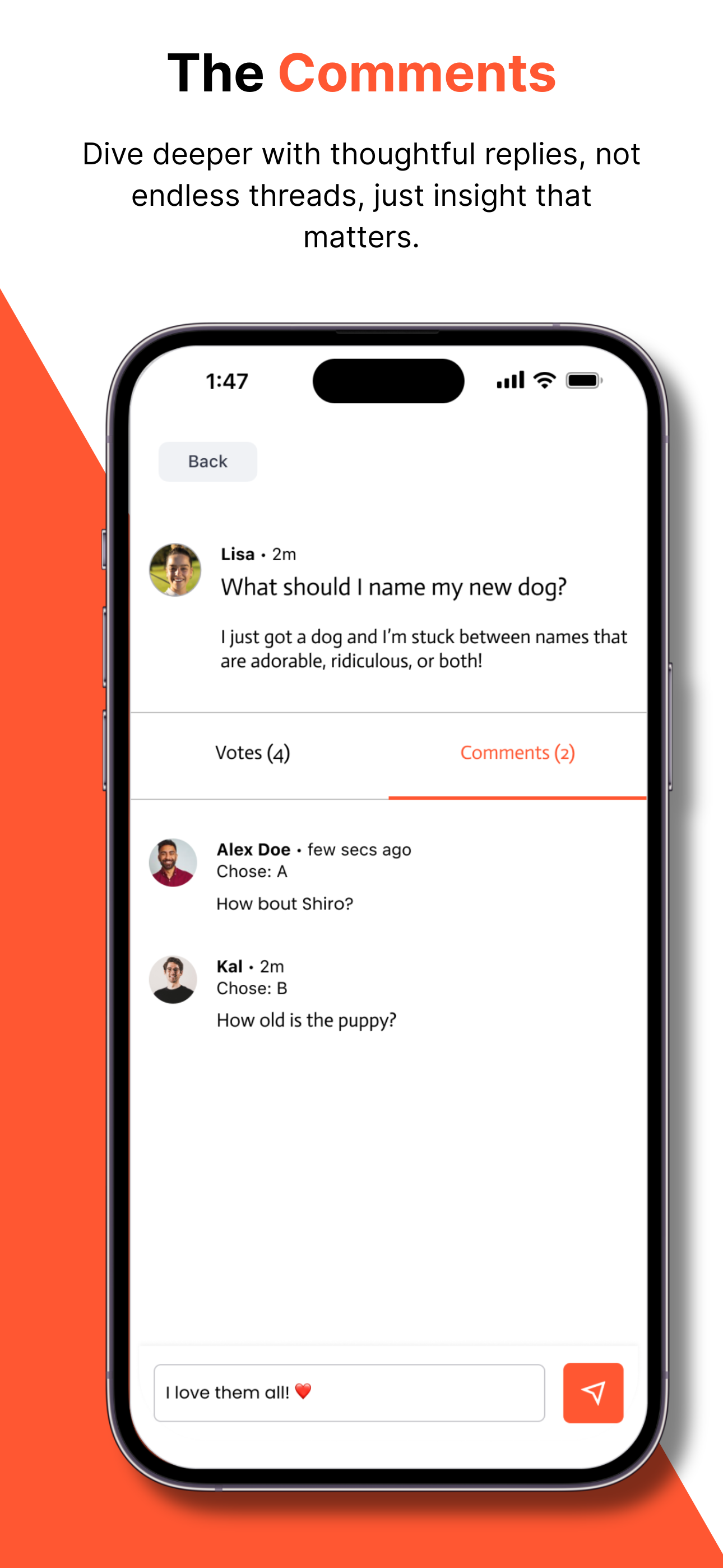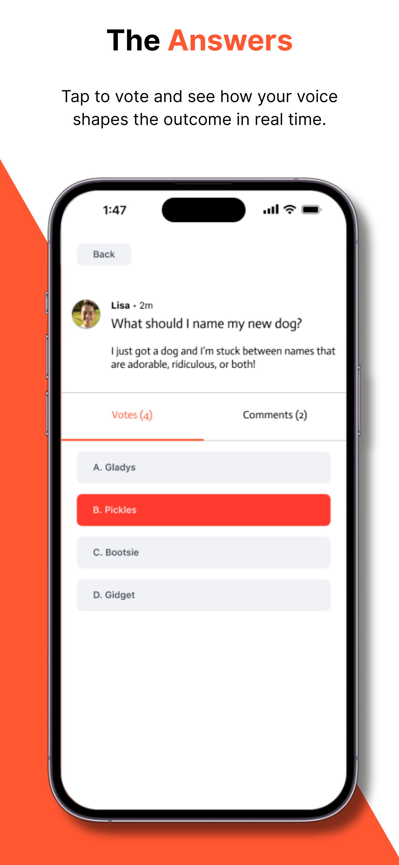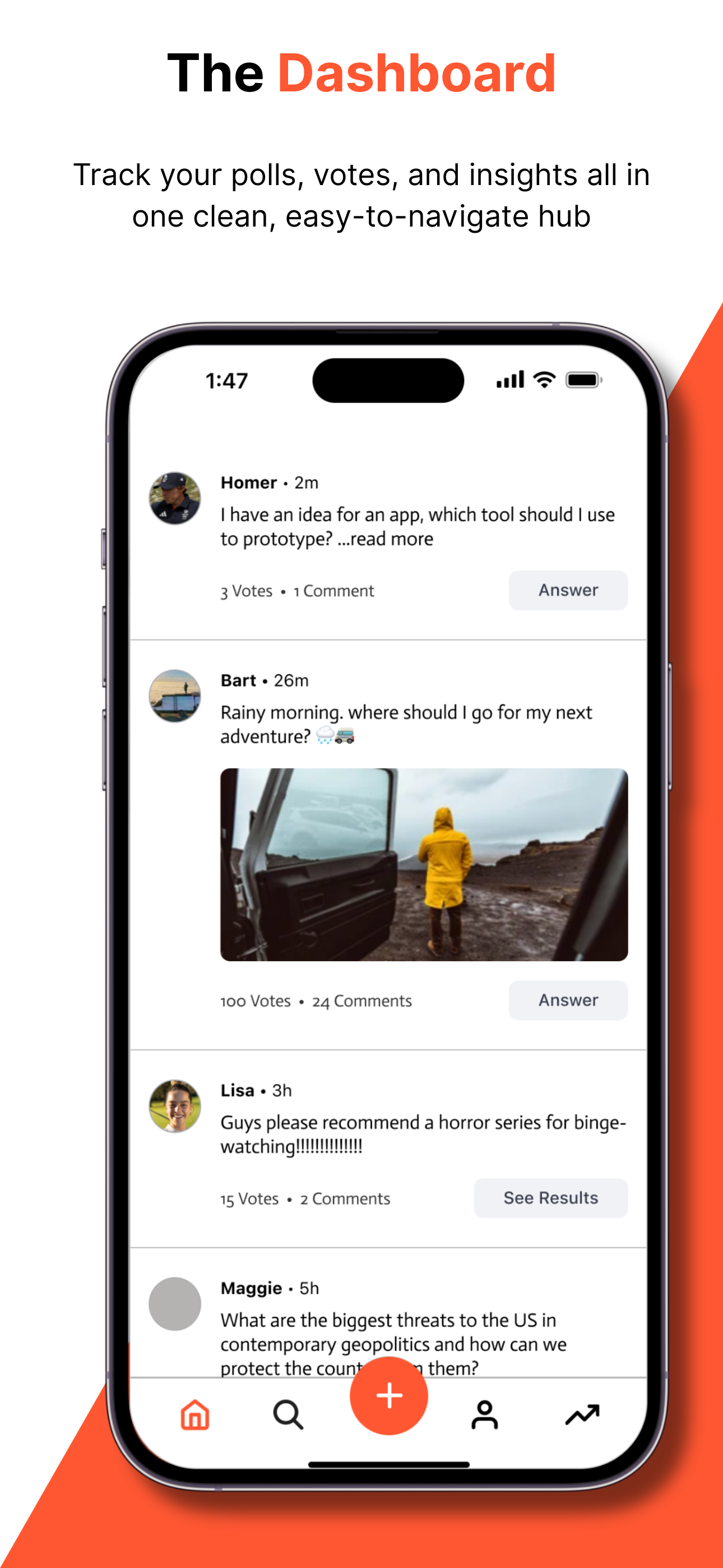Anyone can submit a question to find assistance in - which direction to go, what food to try, etc. In times of doubt, you can post a specific question and offer up to four choices for the WSID community to vote and comment on. The votes are calculated and displayed instantly in a real-time polling chart.