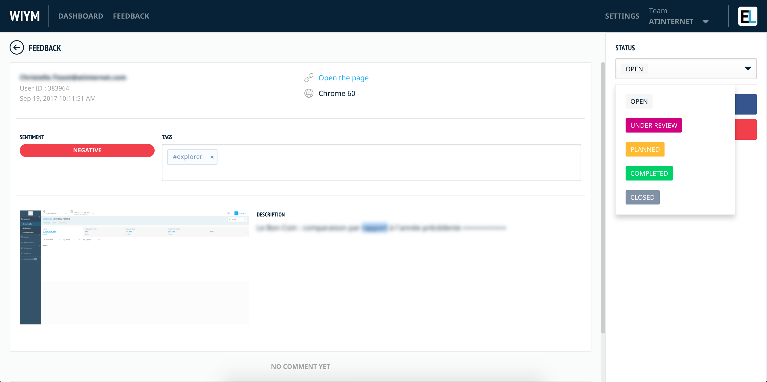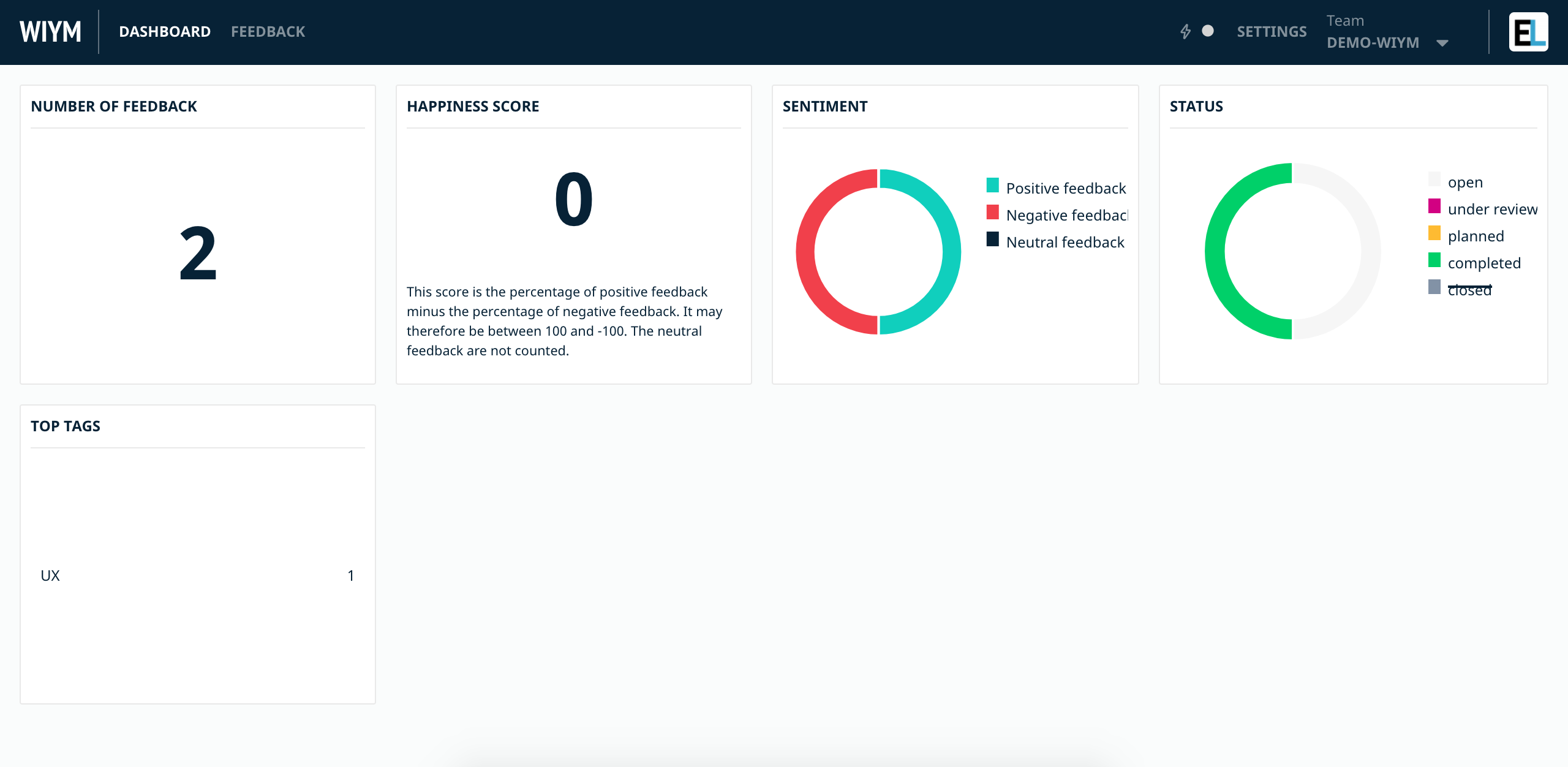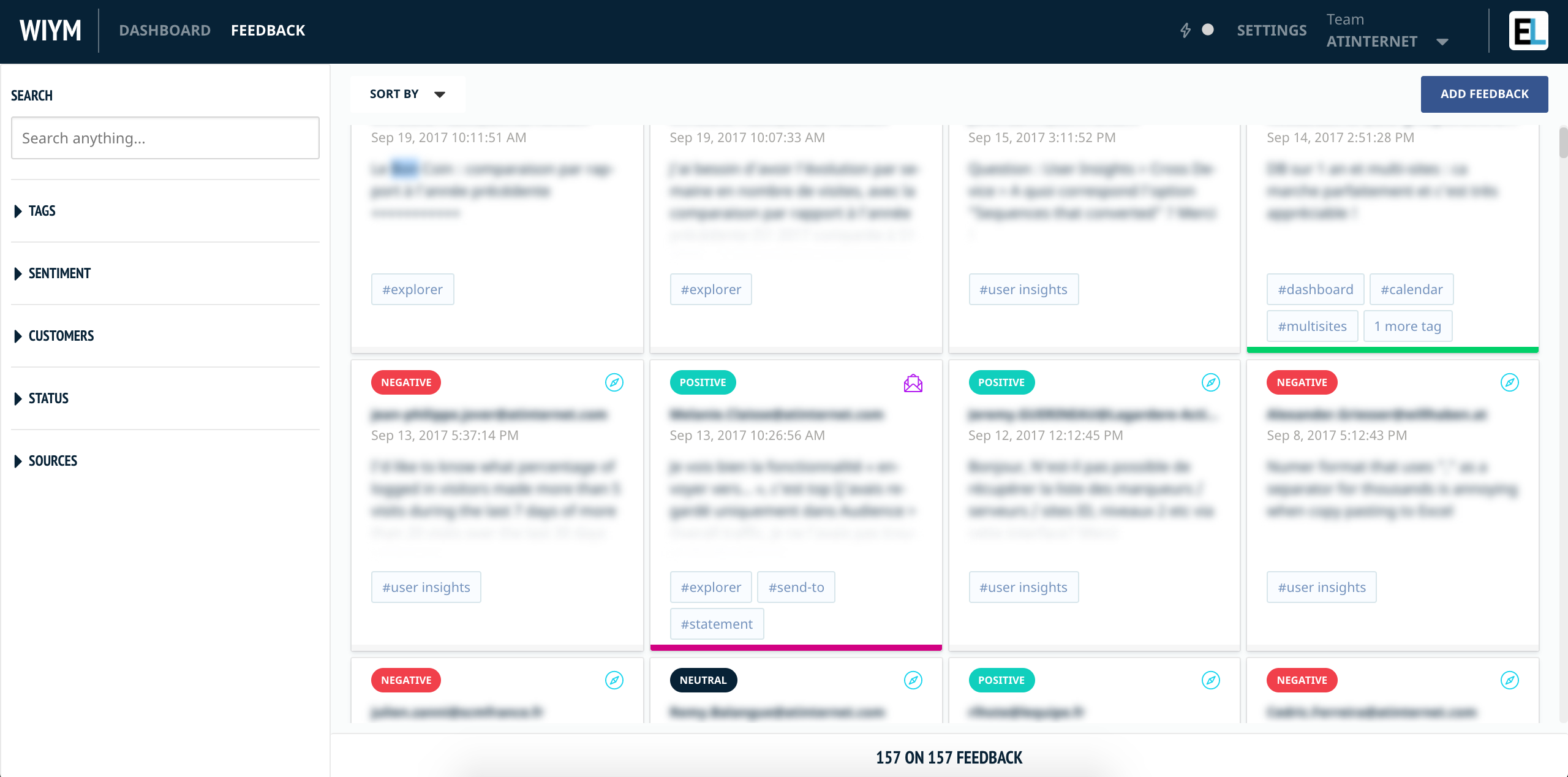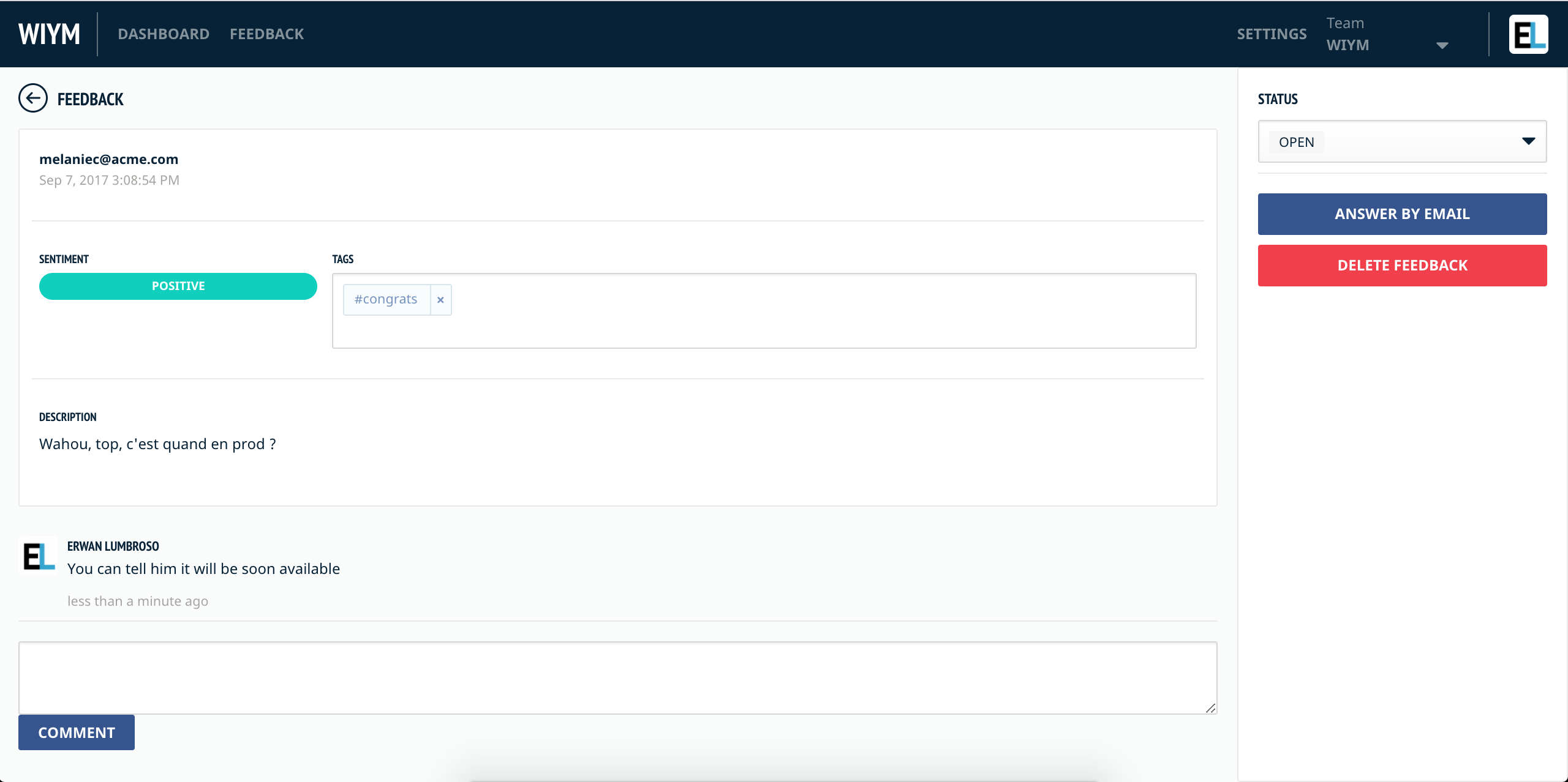Thanks to wiym we now have one single place with all the feedbacks, we can comment the feedback, select the responsible of the next action to do, use the tags to create categories, and a lot more ! Very good product to help the product teams handling the feedback